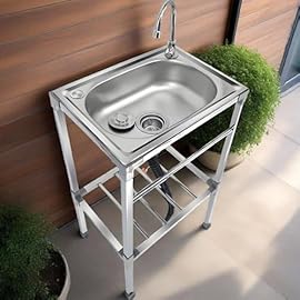 Évier Sur Pieds de Cuisine en Acier Inox 1 Bac Évier De Jardin Extérieur Lavabo Multifonctionnel Commercial Utilitaire avec Robinet Pivotant,pour Garage,Blanchisserie