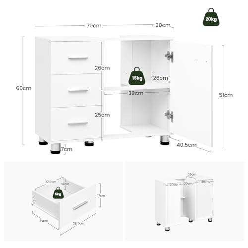 Meuble sous Lavabo Universel : Grâce à son design unique, le meuble de salle de bains convient aux lavabos avec ou sans colonne. Dimensions du meuble/du siphon : 70x60x30 cm/23×20 cm. Mesurez la taille du siphon et du lavabo pour vous assurer que ce meuble de toilette est adapté