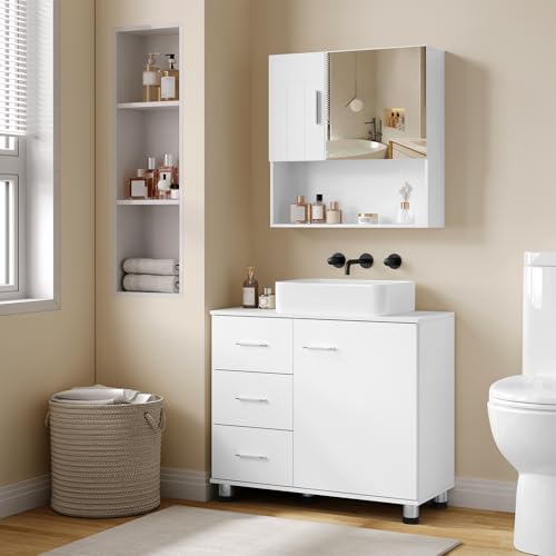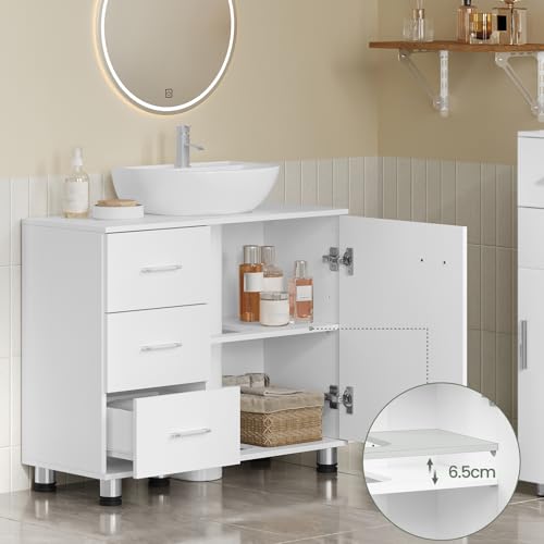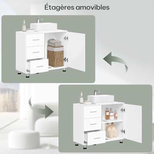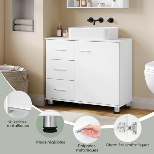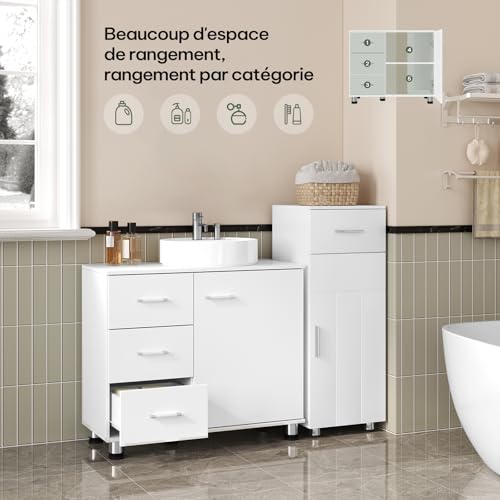 EUGAD Meuble sous Lavabo, Meuble Bas de Salle de Bain sur Pied, avec Tiroirs, Porte, Étagère Réglable, 70x60x30 cm, Blanche