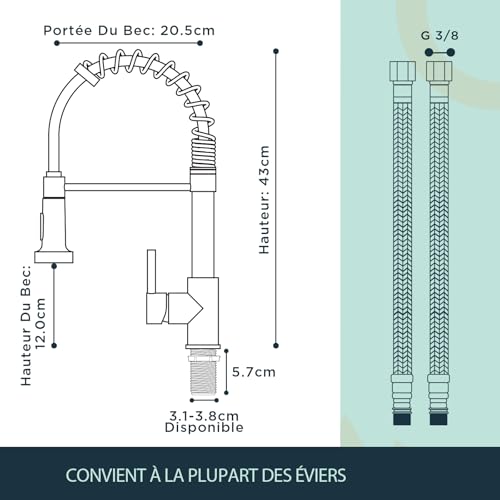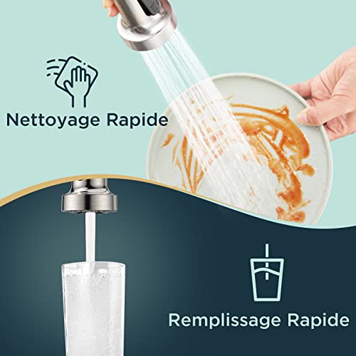 [Facile à Utiliser Toute la Journée] le mitigeur pivote à 360° pour permettre un mouvement complet dans et autour de l’évier. La conception simple et épurée à levier unique offre un contrôle facile et précis de la température et de la quantité de l’eau. La douchette à arc haut offre suffisamment d’espace pour remplir et nettoyer les grands pots et cruches.