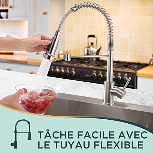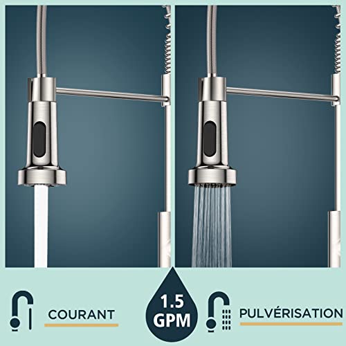 [Parfait Pour Votre Cuisine] avec son design à ressort très incurvé et exposé, le robinet de cuisine combine un look d’inspiration commerciale avec des innovations bien pensées, parfait pour un usage domestique. La finition raffinée en acier inoxydable reflète la beauté des appareils en acier inoxydable et donne un look élégant, raffiné et facile à assortir qui s’harmonise avec n’importe quel décor de cuisine.