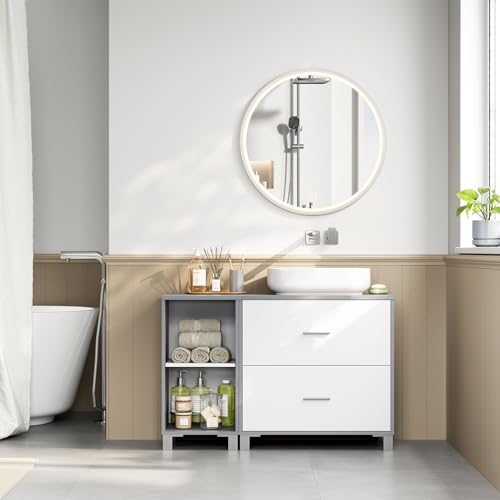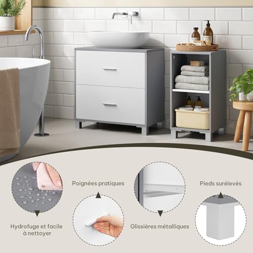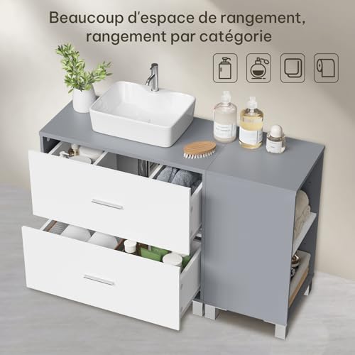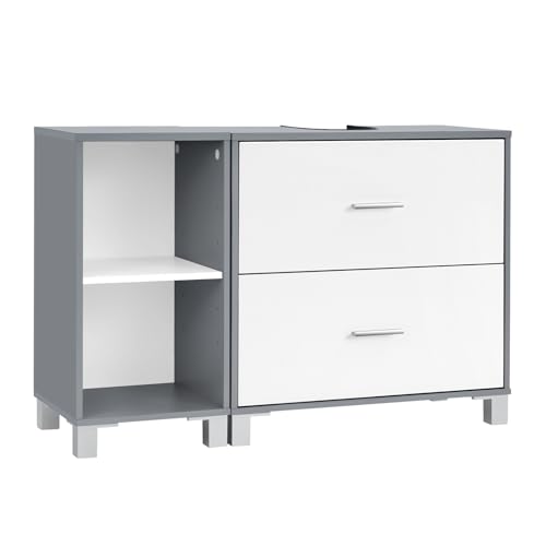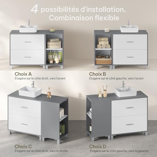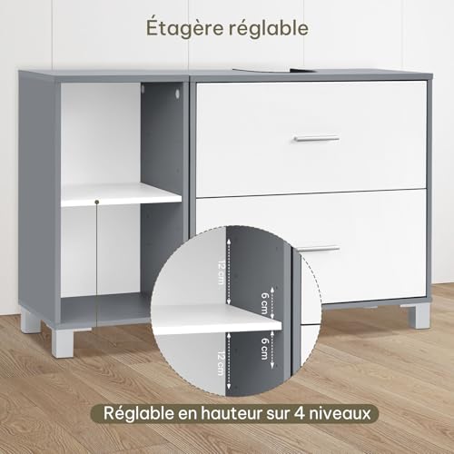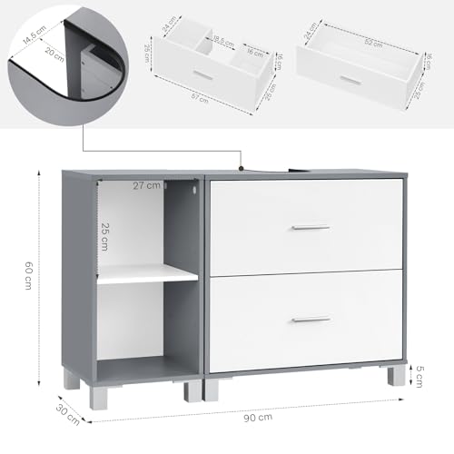 Meuble sous Lavabo, avec 2 Tiroirs, Découpe pour Siphon 20×14,5 cm et 1 Meuble Latéral avec 2 Compartiments, Cloison Réglable, Blanc, 90x30x60 cm, Blanc + Gris