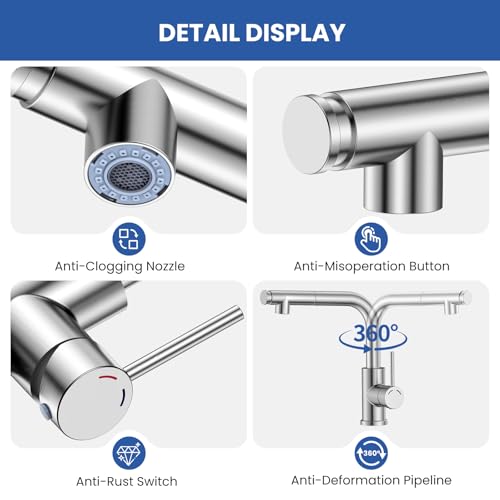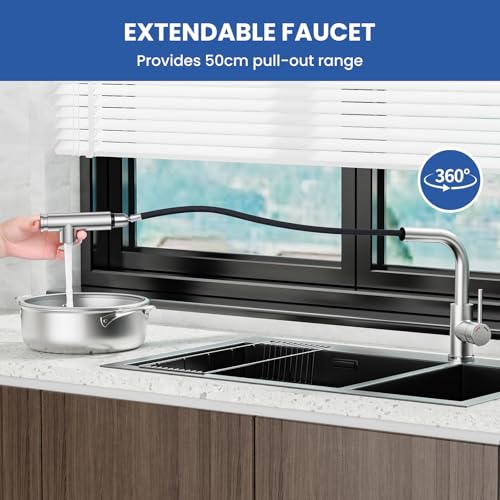 Design exquis, pratique et beau : le robinet de cuisine SREWOHS PRO présente un design moderne et simple, une douche rétractable en forme de L, simple et élégant, s’intègre parfaitement dans toute cuisine moderne. Le bec d’eau relativement élevé et la fonction pivotante à 360° sont très pratiques