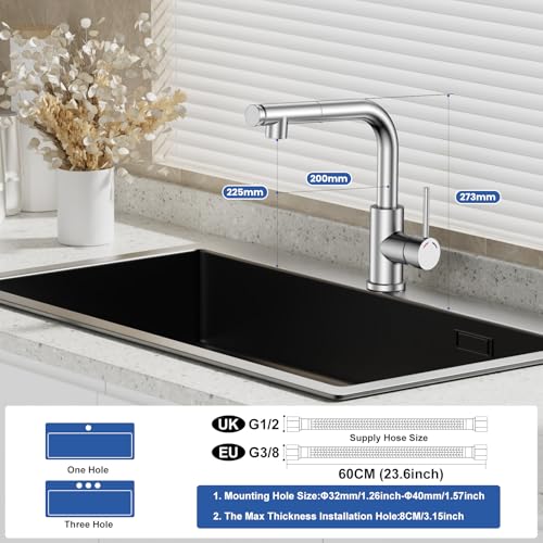 Facile à installer : convient pour un montage à un trou, trou de montage : ø32-40 mm. Épaisseur de la plaque de montage applicable : 1 à 35 mm. 2 tuyaux de 53,5 cm et raccords universels G3/8. Tous les accessoires nécessaires sont inclus et les instructions de montage pour le robinet sont intégrées. Vous pouvez monter vous-même le robinet d’évier en quelques étapes