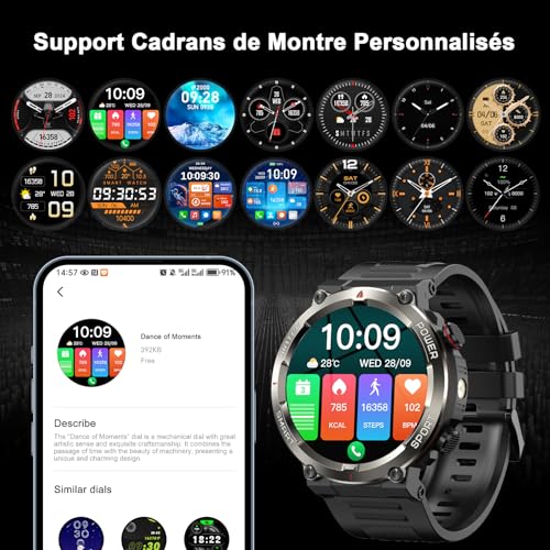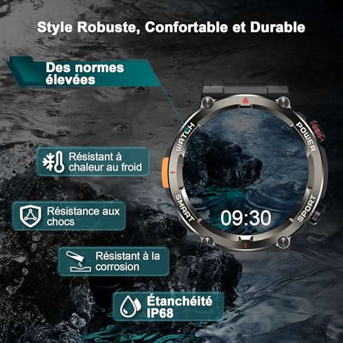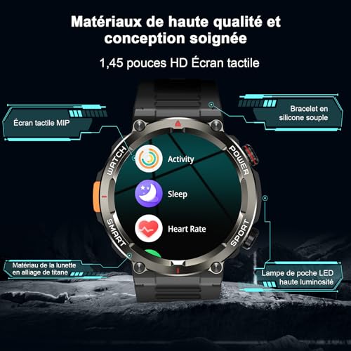 📱【Écran Smart Command de 1,45 pouce】Cette montre connectée reste connectée même en cas de tempête : l’écran HD de 1,45 pouce (320 x 280 pixels) avec verre antireflet est parfaitement lisible, même en plein soleil ou pendant les quarts de nuit. Cadrans riches et variés : Plus de 220 cadrans préinstallés et des designs personnalisables ! La connectivité Bluetooth 5.3 et le microphone antibruit à 360° garantissent des appels sans interruption, même par vent jusqu’à 30 km/h. Notifications en temps réel pour WhatsApp, SMS et appels (Android/iOS).
