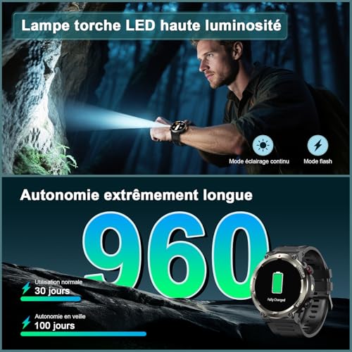 ⚡ 【Batterie grande capacité 960 mAh : 100 jours d’autonomie en veille】La batterie de 960 mAh surpasse de loin celle des montres standard (360 mAh) : 20 jours de fonctionnement complet (appels/suivi d’activité) ou 100 jours en veille. Testée pour 720 heures de fonctionnement continu à -20 °C, elle est parfaite pour les randonnées de plusieurs jours sans alimentation. Plus besoin de se soucier de la charge !