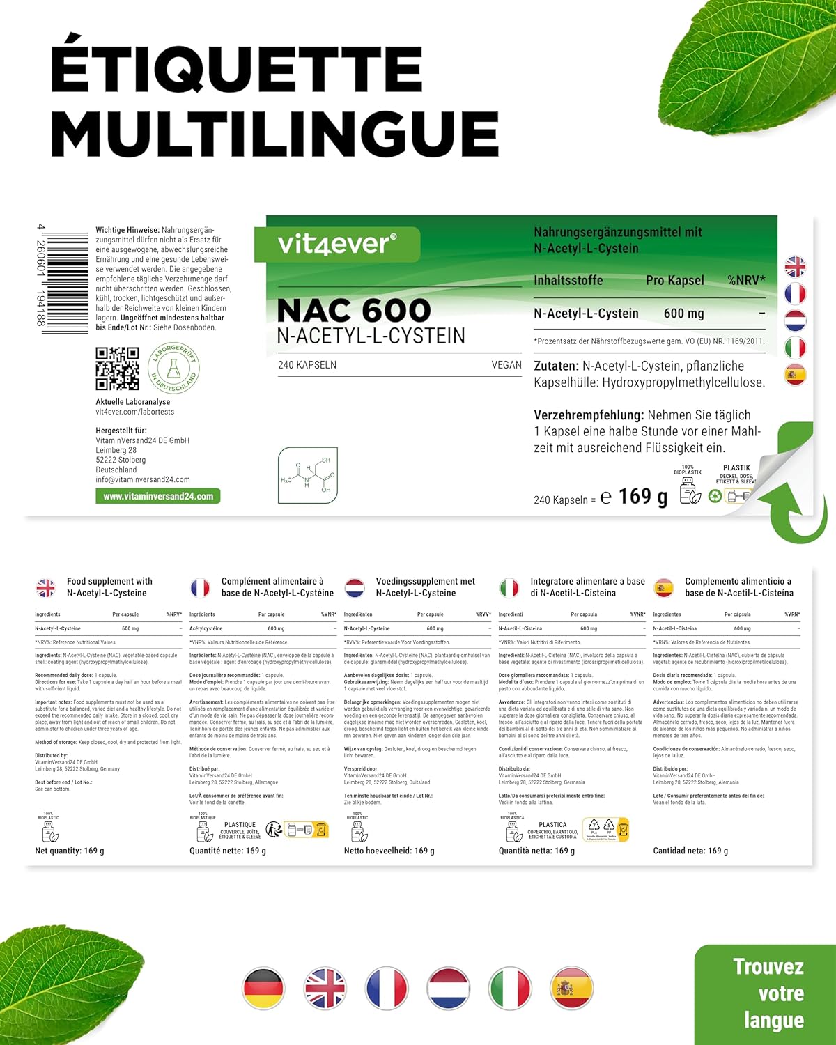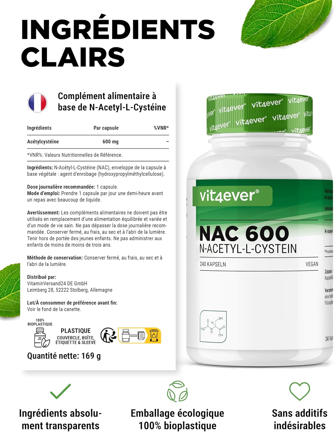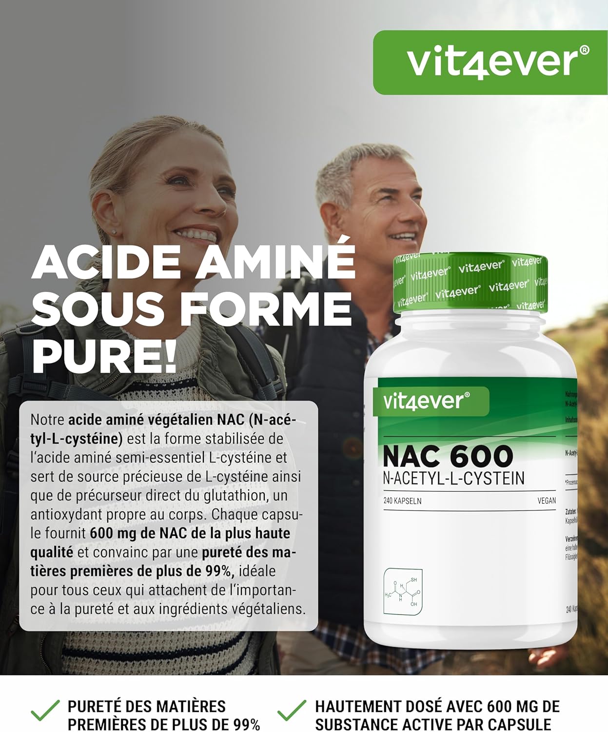 À propos de cet article RÉSERVE DE 8 MOIS : chaque boîte contient 240 gélules hautement dosées contenant chacune 600 mg de N-acétylcystéine (NAC), ce qui est suffisant pour une réserve pratique de 8 mois en prenant seulement 1 gélule par jour. AMINOSAÏRE PREMIUM : La N-acétylcystéine (NAC) est une forme particulièrement biodisponible et stable de l’acide aminé L-cystéine. Contrairement à la L-cystéine traditionnelle, qui est rapidement dégradée dans l’organisme, la liaison acétyle assure une meilleure stabilité. La L-cystéine est un élément central de l’antioxydant glutathion produit par l’organisme et joue donc un rôle important dans le système de protection antioxydant. NAC SOUS FORME NATURELLE : notre N-acétyl-L-cystéine est obtenue à partir d’une source purement végétale et ne contient aucun additif synthétique. La qualité supérieure des matières premières assure une excellente biodisponibilité. Pureté des matières premières de plus de 99 % pour une tolérance optimale. INGRÉDIENTS CLAIRS : Chaque ingrédient que nous utilisons est directement mentionné sur l’étiquette. Nous nous engageons à une transparence absolue. Nos comprimés sont exclusivement à base d’ingrédients végétaux, sont végétaliens et ne contiennent aucun additif. Ils ne contiennent pas de PEG, de carraghénanes, d’arômes artificiels ou de stéarate de magnésium. QUALITÉ VIT4EVER : La gamme Vit4ever propose une multitude de compléments alimentaires pour chaque groupe cible. Nos produits sont fabriqués à partir de matières premières de qualité supérieure et produits exclusivement dans des entreprises de l’UE soigneusement sélectionnées afin de garantir une qualité élevée et constante. L’Allemagne et les Pays-Bas font partie de nos sites de production. Si vous n’êtes pas satisfait d’un produit ou si vous avez besoin d’aide, nous sommes toujours à votre disposition.