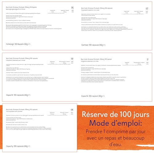 NUTRITIONS IMPORTANTES : Le picolinate de chrome de Now Foods contient 200mcg de chrome, un nutriment important qui participe à de nombreux processus dans le corps humain