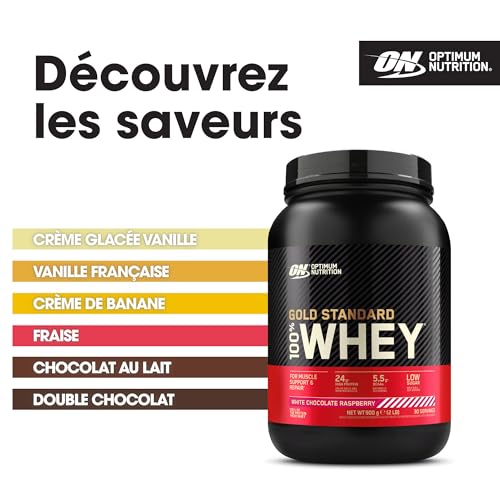 Optimum Nutrition Gold Standard 100% WHEY est la poudre de protéines la plus vendue au monde*. Rapide et facile à préparer, notre protéine de lactosérum de haute qualité est idéale pour augmenter votre apport en protéines au petit-déjeuner, et donner un coup de fouet à la synthèse des protéines musculaires avant votre entraînement et dans le cadre de votre programme de récupération**. La poudre de protéines de lactosérum ON est certifiée Informed Choice et il est prouvé qu’elle vous aide à maintenir le cap sur vos objectifs de remise en forme. Notre formule primée contient des BCAA et de la glutamine d’origine naturelle, ainsi que 24 grammes de poudre de protéines de lactosérum de haute qualité à absorption rapide, dont l’isolate de protéines de lactosérum est l’ingrédient principal, qui aide à la prise de muscle et favorise la récupération* après chaque séance d’entraînement. Conçue pour les athlètes axés sur leurs objectifs, les amateurs de fitness et ceux qui cherchent à se mettre en forme, notre poudre protéinée de pré-entraînement ON est proposée dans une variété de saveurs savoureuses : chocolat doublement riche, crème de banane, glace à la vanille, chocolat blanc framboise, délicieuse fraise et bien d’autres encore. Les faibles quantités de sucre et de graisse maintiennent des proportions saines. La formule prête à mélanger de Gold Standard Whey vous permet de la déguster à tout moment de la journée, que ce soit sous forme de shakes protéinés ou en complément de vos repas et boissons préférés – notre poudre protéinée non aromatisée est parfaite pour créer vos propres recettes savoureuses. La protéine de lactosérum Gold Standard est disponible en différentes tailles de portion et est facile à préparer : il suffit de mélanger une dosette dans 180-240 ml d’eau froide. La poudre de protéine ON est meilleure lorsqu’elle est consommée à la première heure du matin ou/et pendant les 30 minutes juste avant ou immédiatement après l’entraînement. *Source : Euromonitor International Limited ; Edition Santé des Consommateurs 2023, Catégorie Poudre de Protéines pour Sports, % de parts de valeur au détail, données 2022 ** Les protéines favorisent la croissance et le maintien de la masse musculaire : Source : EFSA Journal 2010;8(10):1811 ; 2011;9(6):2204