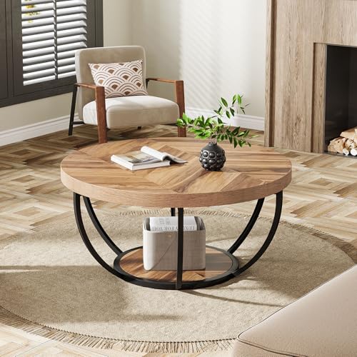 Tribesigns Table basse ronde de cocktail industrielle moderne à 2 niveaux avec étagères, table d’appoint de canapé circulaire avec pieds en métal pour le salon, la maison, grain de bois