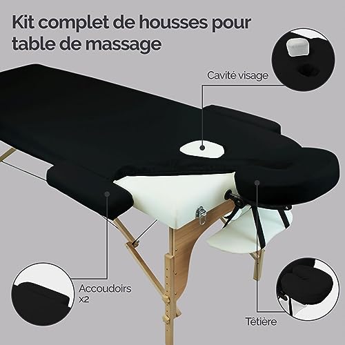 KIT COMPLET Le kit se compose de 4 pièces résistantes : une housse pour la têtière, deux housses pour les accoudoirs ainsi qu’un drap-housse pour la table. Répondant à tous vos besoins, ce drap-housse dispose d’une cavité visage permettant de réaliser des massages sur le ventre tout en respirant sereinement. Il vous permet de proposer une aisance supplémentaire à vos massages.